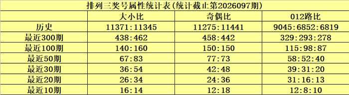 上期回顾:排列三第2026097期奖号为226,奖号012路比为1:0:2,奇偶比为0:3,大小比为1:2,和值为10,跨度为4。